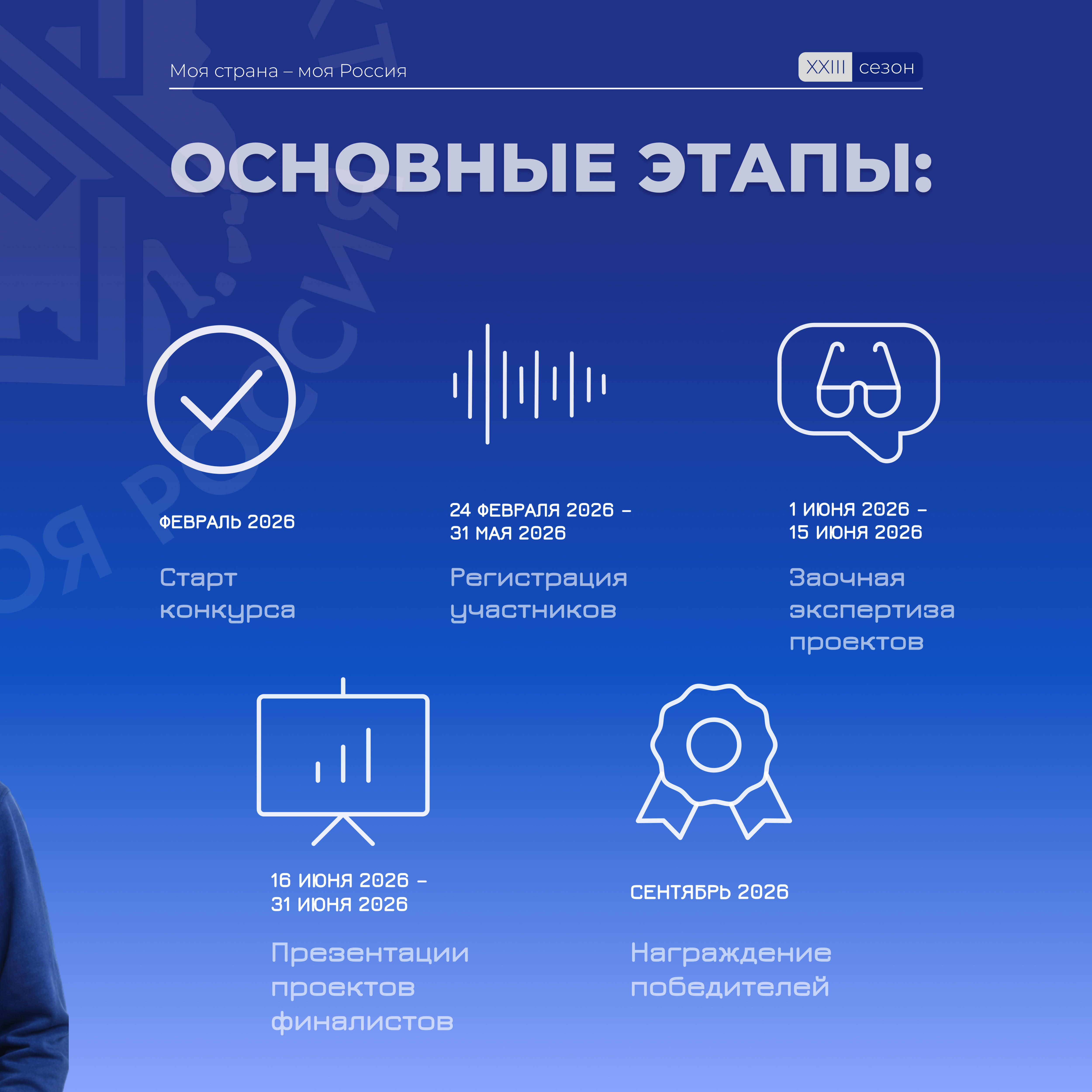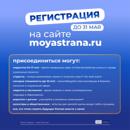 Всероссийская ассоциация развития местного самоуправления (ВАРМСУ) информирует о проведении в 2026 году XXIII Всероссийского конкурса молодежных авторских проектов и проектов в сфере образования, направленных на социально-экономическое развитие российских территорий – «Моя страна – моя Россия». Регистрация и подробная информация о конкурсе на сайте https://moyastrana.ru/?lang=tr